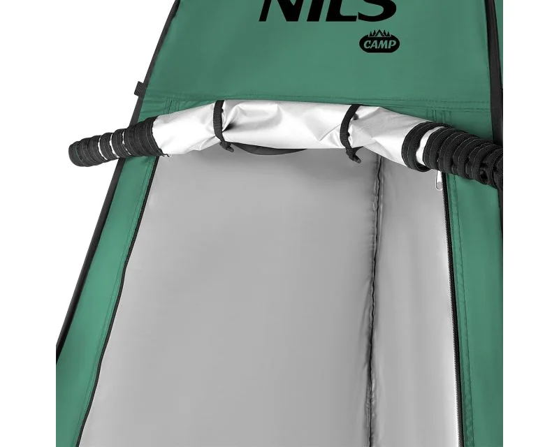 Dušas persirengimo kambarys, palapinė, Nils Camp NC1706 pagamintas iš 190T poliesterio, pasižyminčiu atsparumu vandeniui ir atsparumu dilimui. Ant vidinio sluoksnio yra sidabrinė izoliacinė danga, kuri suteikia šiluminį komfortą ir neleidžia įkaisti. Medžiaga yra visiškai nepermatoma.