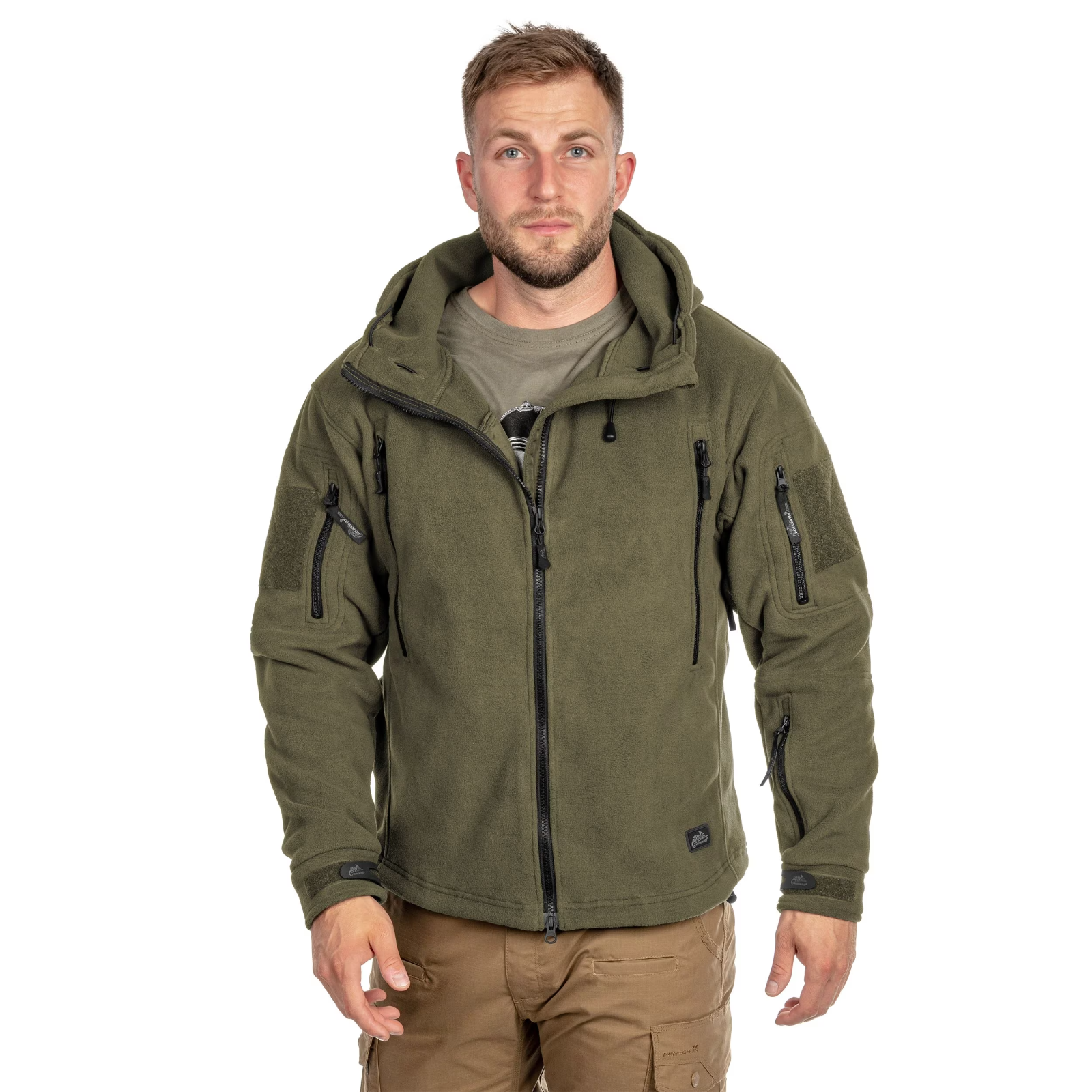 Džemperis Helikon Patriot su kapišonu, pasiūtas iš tankaus sintetinio fliso, nesugeriančio drėgmės ir greitai džiūstančio. Tinkamas dėvėti šiltesniu metų laiku kaip plona striukė, o šaltesniu kaip vidurinis, šilumą sulaikantis, sluoksnis. Aukšta apykaklė ir kapišonas patikimai apsaugo nuo vėjo. Ant krūtinės prisiūtos dvi talpios kišenės. Trys kišenės ant rankovių skirtos smulkiems daiktams. Talpi kišenė nugaroje. Pažastyse įsiūti užtrauktukai, kurių pagalba pagerinama ventiliacija aktyviai judant. Viršutinėje rankovių dalyje numatytos vietos identifikacinių ženklų tvirtinimui („Velcro“). Alkūnių sritis papildomai apsiūta trinčiai atspariu audiniu.