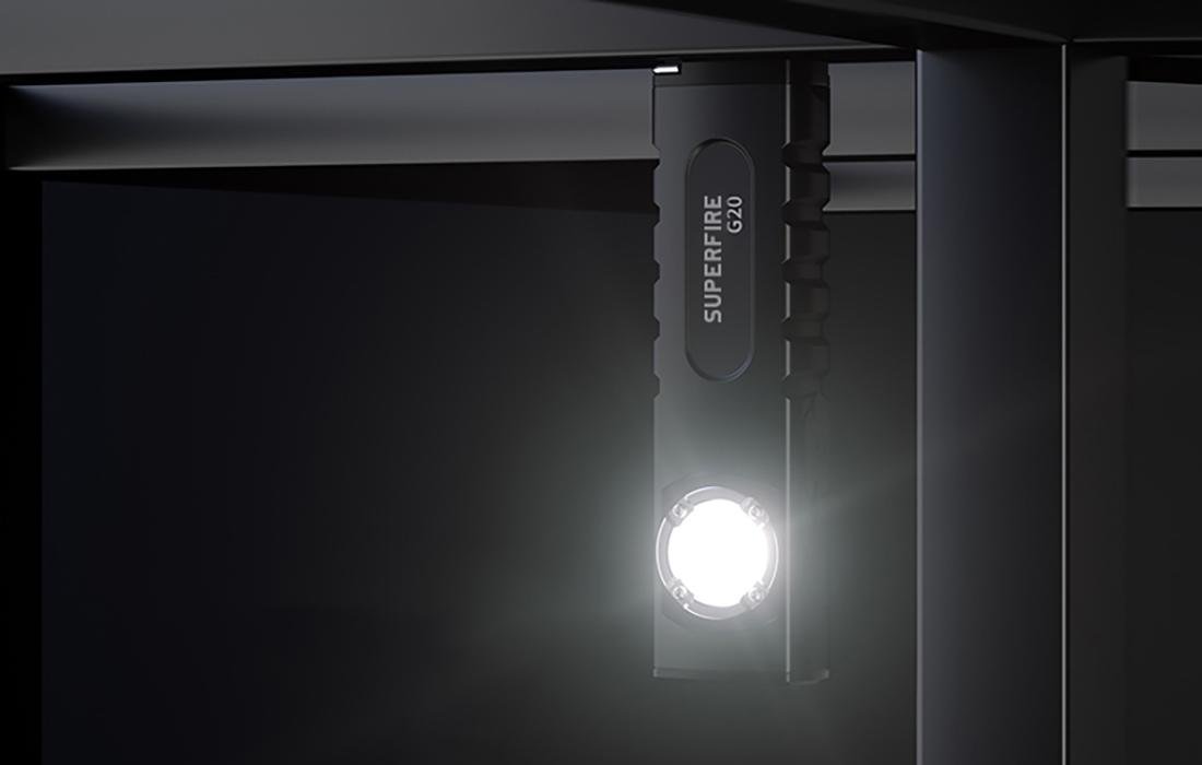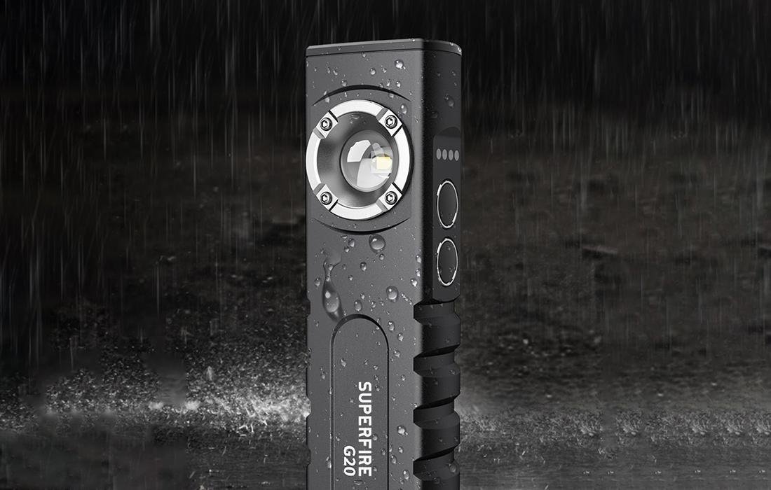 - „Superfire G20“ žibintuvėlis, nepaisant mažo dydžio, stebina puikiomis galimybėmis. Be įprasto apšvietimo, jis taip pat siūlo raudoną lazerį, o dėl IP44 atsparumo vandeniui galite jį naudoti beveik bet kokiomis sąlygomis. Prietaisas vienu įkrovimu gali veikti net 3–6 valandas, o prireikus taip pat galite jį naudoti kaip praktišką maitinimo šaltinį. Žibintuvėlio naudojimą palengvina praktiniai elementai, tokie kaip specialus spaustukas, kabliukas ir magnetinis pagrindas.