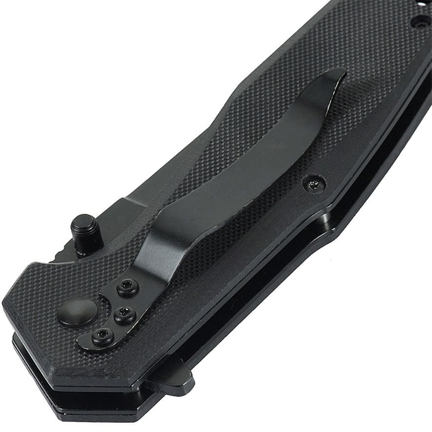 Spyruoklinis plieninis segtukas leidžia patogiai nešiotis peilį prikabinus prie diržo ar kišenės krašto.