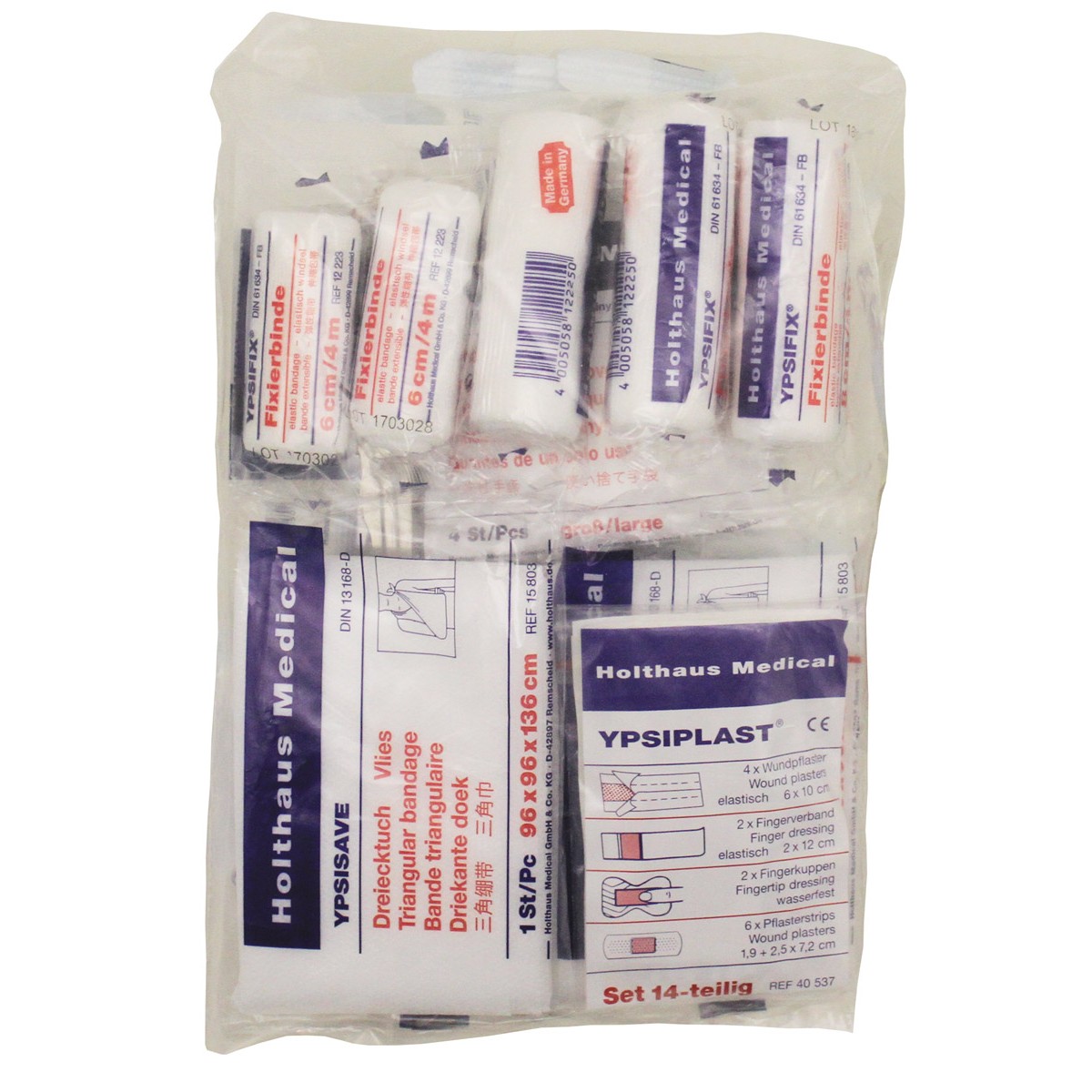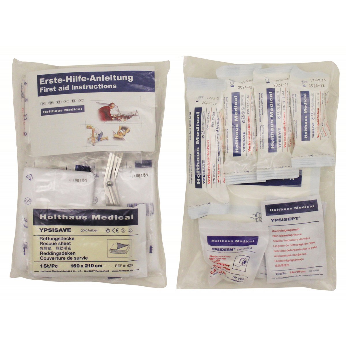 Pirmosios pagalbos vaistinėlės papildymo rinkinys HOLTHAUS 43 dalių pagal DIN 13164. Tinka automobiliui, motociklui ar namams – patikimas vaistinėlės papildymas.
