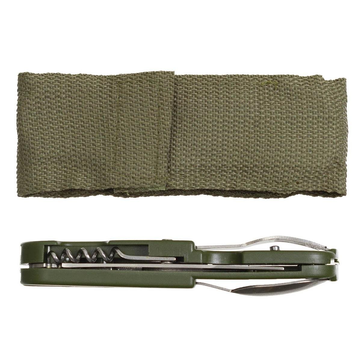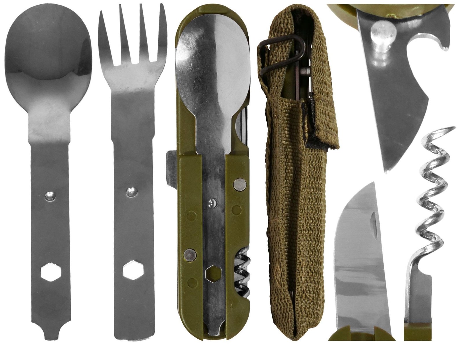 - Rinkinį sudaro: dėklas segamas prie diržo, peilis, šaukštas, šakutė, atidarytuvas