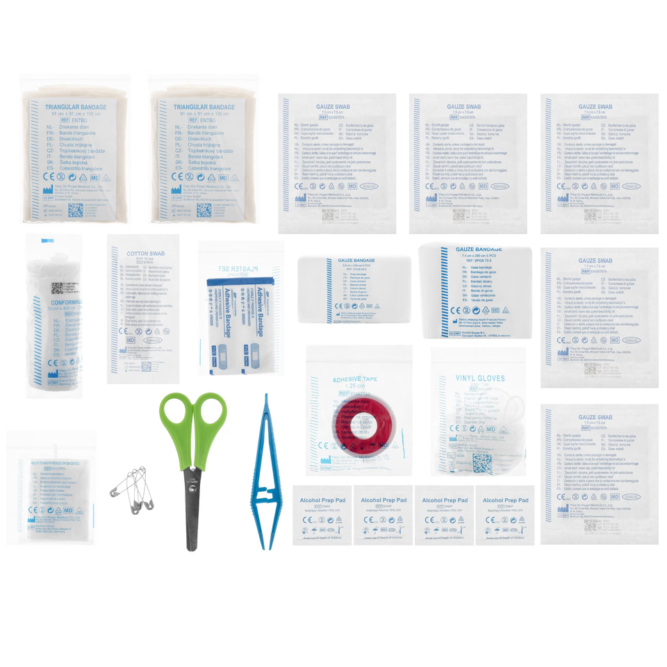 Pirmosios pagalbos vaistinėlė su būtiniausiais reikmenimis. Sutalpinta į krepšelį, pagamintą iš tvirto poliesterio audinio. Vidiniai skyriai leidžia tvarkingai suskirstyti pirmosios pagalbos reikmenis.
