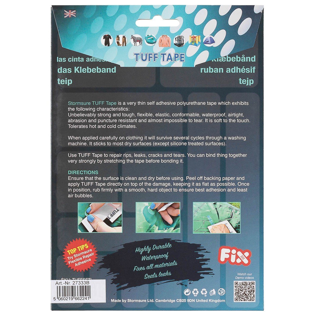 Stormsure ‘TUFF Tape’ yra labai tvirta, skaidri, lipni, vandeniui atspari juosta, kuri paruošta kaip atskiri iš anksto supjaustyti įvairių formų ir dydžių lopai ir juostelės. TUFF juosta pagaminta iš plonos, bet labai tvirtos poliuretano plėvelės.